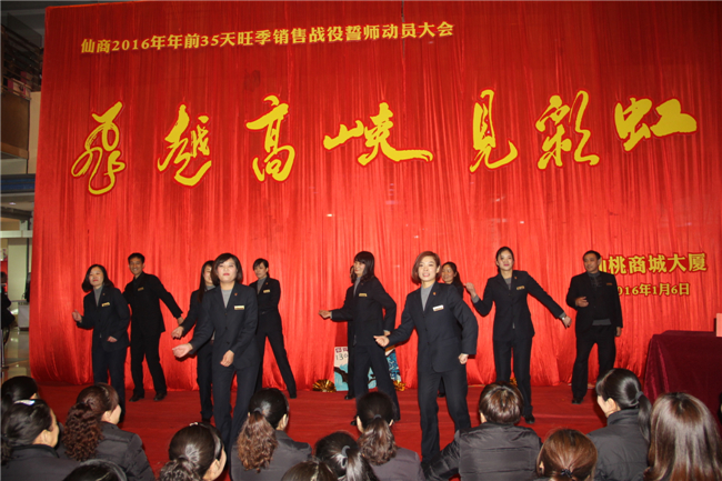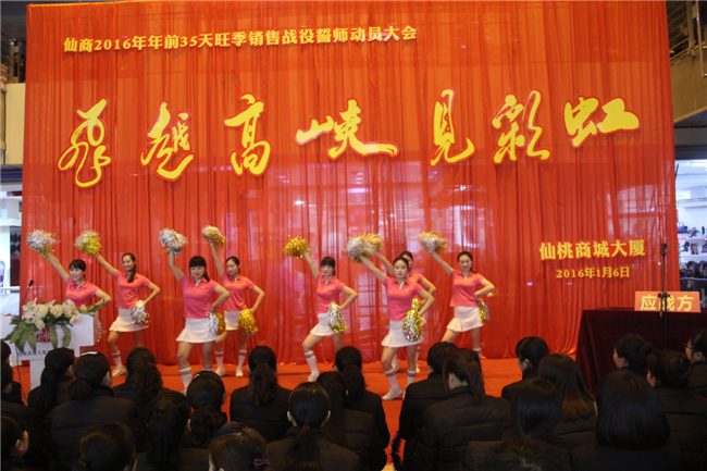 2016年元月6日晚上19:30分,3000名仙商人在仙商北一楼中厅隆重召开主题为“飞越高峡见彩虹”的2016年春节前35天旺季贩卖战役誓师大会。