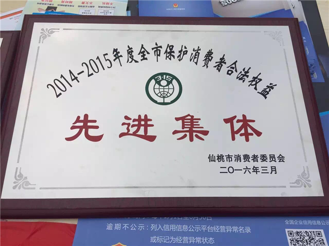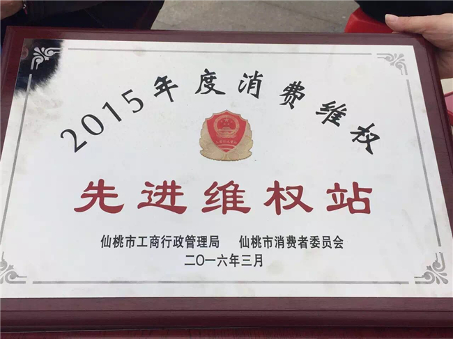 仙商喜获“仙桃市2015年度消耗维权先辈维权站”荣誉