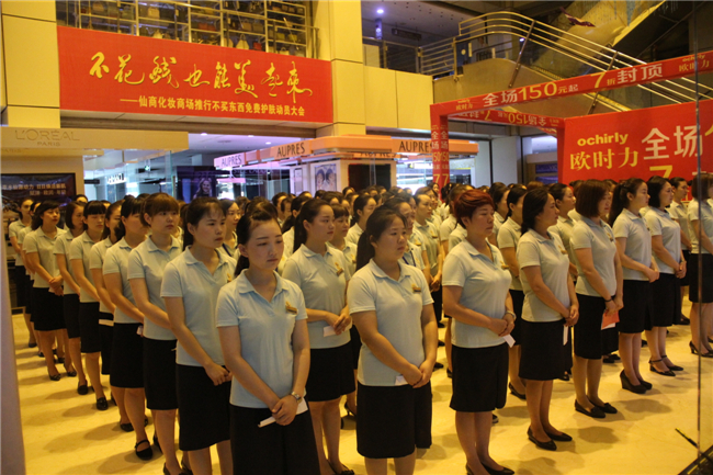 为了让顾客享受更多的知心服务,2016年7月18日上午,仙商在北楼中厅举行主题为“不花钱也能美起来”——化妆商场推行不买东西免费护肤动员大会。
