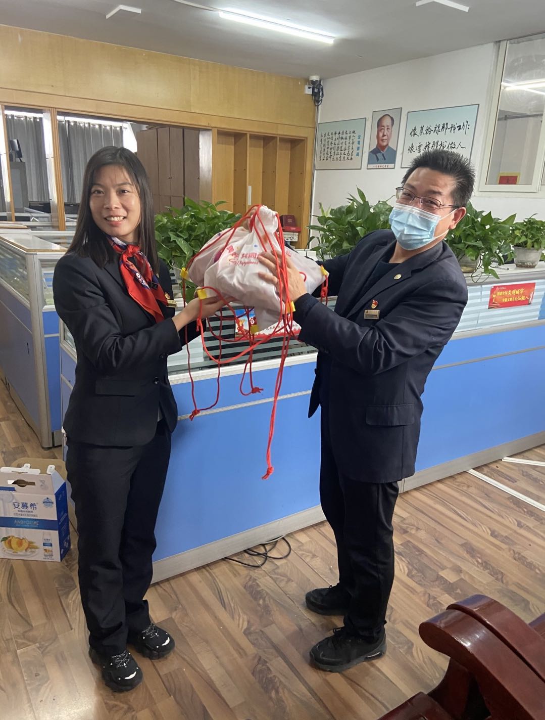 店总刘雅萍(右)为员工发放“双11”能量加油包