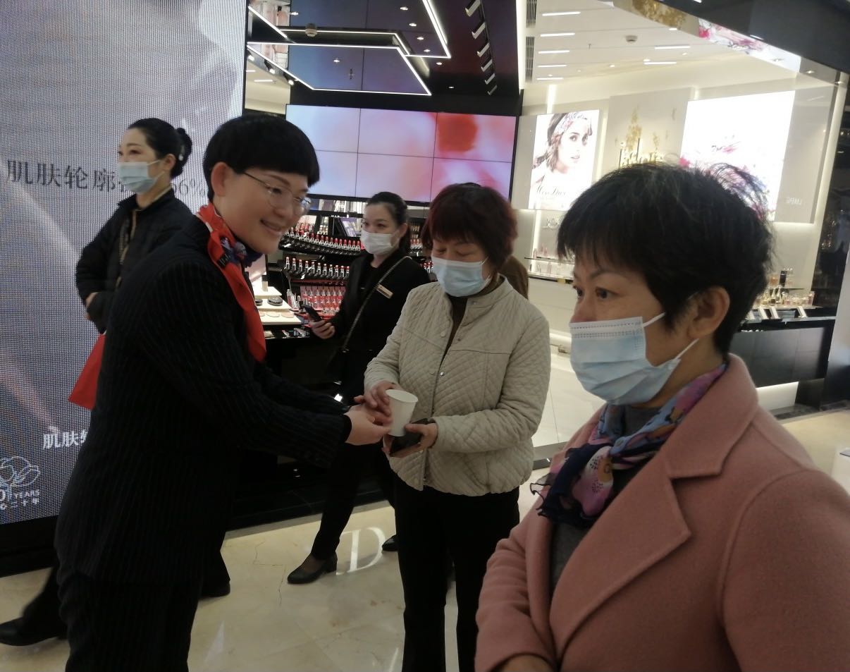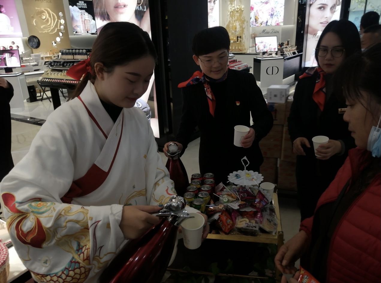 仙商总经理刘雅萍(左)为“双11”进店顾客送上暖心的早点
