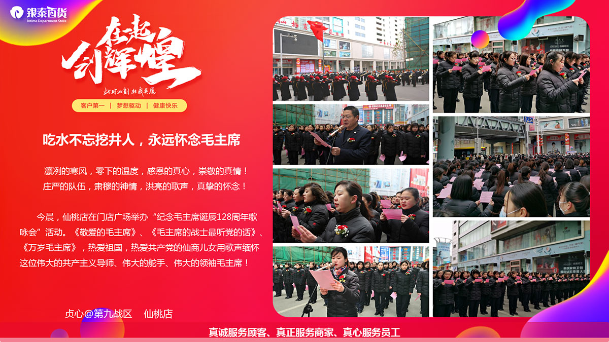 今晨,仙桃店在门店广场举办“纪念毛主席诞辰128周年歌咏会”运动。《敬爱的毛主席》、《毛主席的兵士最听党的话》、《万岁毛主席》,热爱祖国,热爱*********的仙商儿女用歌声想念这位巨大的共产主议导师、巨大的舵手、巨大的领袖毛主席!
