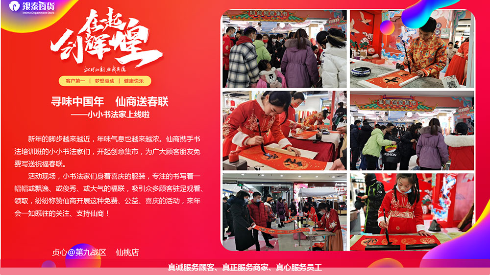 新年的脚步越来越近,年味气息也越来越浓。仙商携手书法培训班的小小书法家们,开起创意集市,为广大顾家同伙免费写送祝福春联。