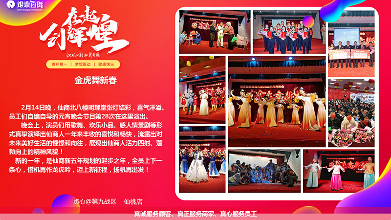 2月14日晚,仙商北八楼明理堂张灯结彩,喜气洋溢。员工们自编自导的元宵晚会节目第28次在这里演出。