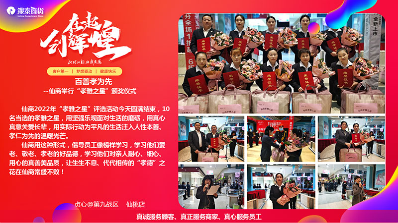 仙商用这种情势,倡导员工像榜样学习,学习他们爱老、敬老、孝老的好品德,学习他们对亲人耐心、仔细、埋头的真善美品质,让生生不息、代代相传的“孝德”之花在仙商常盛不败!
