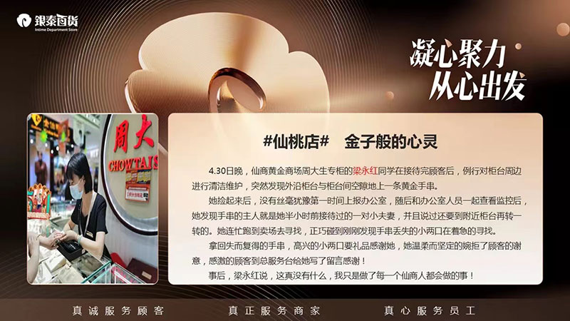 4月30日晚,仙商黄金商场周大生专柜的梁永红同窗在接待完顾客后,例行对柜台周边进行清洁维护,忽然发现外沿柜台与柜台间闲暇地上一条黄金手串。