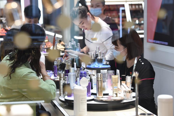 (消耗者在银泰仙商兰蔻专柜体验试妆)