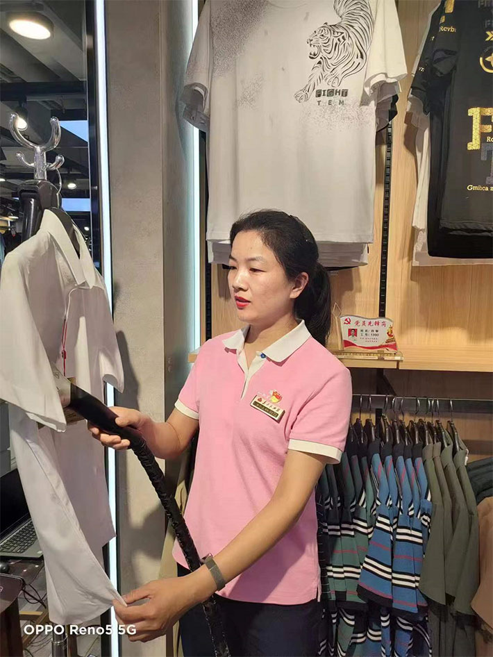 在综合楼二楼男装商场荟萃二柜柜台上,一块党旗飘扬式样的牌子格外引人注目,上面有烫金的几个大字逐一“党员前锋示范岗”,肖敏即是银泰仙商这批一线示范岗通俗党员中的一员。