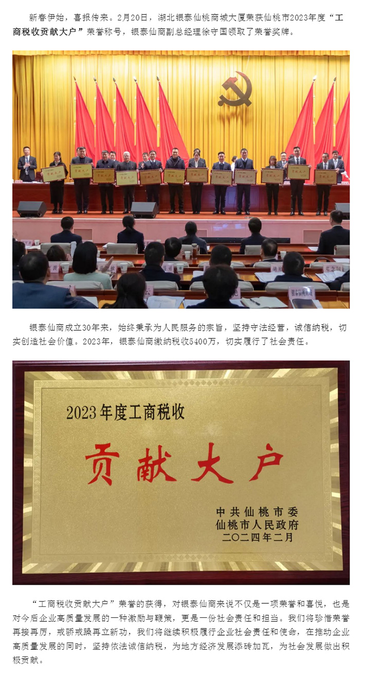 银泰仙商荣获仙桃市2023年度“工商税收贡献大户”荣誉称号