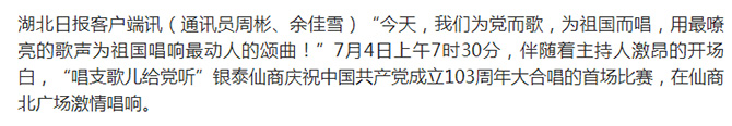 “每年七月仙商的红歌大合唱,不仅是仙商人的仪式感,也是我们仙桃人的仪式感。”市民王玲带着孩子一路来观赛,现场感受合唱氛围。