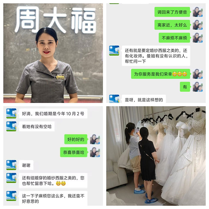 得知顾客困境后,王曼第临时间回复“别发急,我来帮你咨询”,随即动手解决题目。她精心筛选并保举了仙桃三家着名婚纱摄影店,行使放工时间前往各店拍摄婚纱、制服视频,还托熟人细致咨询价格,及时将这些信息同步给顾客。考虑到10月2日是结婚大日子,化妆师档期严重,王曼想到公司年会合作过的化妆师营业娴熟,马上联系咨询,在确认有档期后,敏捷为顾客与化妆师互推微信。