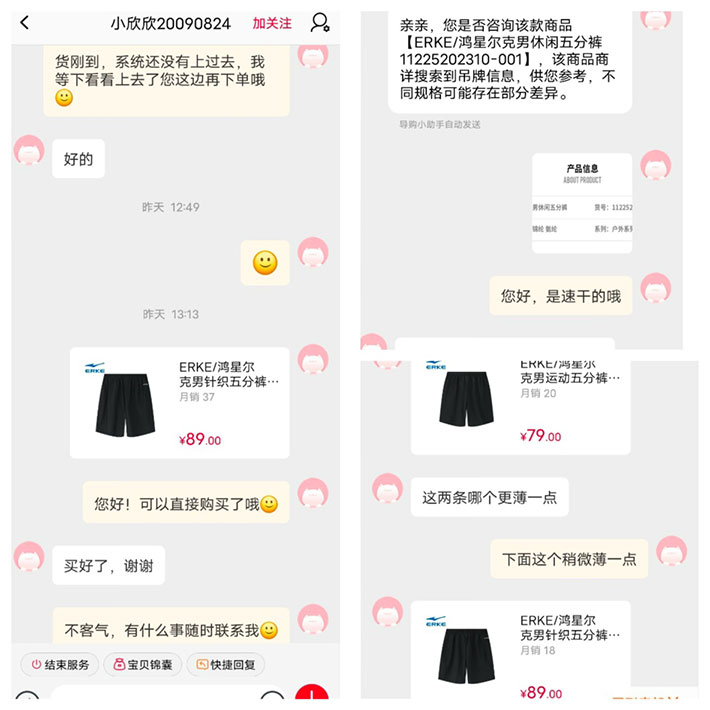 次日,当顾客此前咨询过的另一款产品到货后,赵雪琴第临时间通过喵街告知顾客,用自动跟进的态度连续优质服务。顾客对这份及时与埋头十分认可,爽快完成第二笔下单。