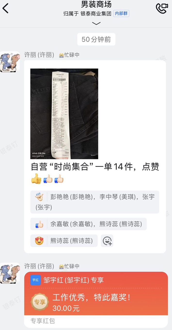 结账时,顾客对2108元的总价十分惊喜,连连称赞“物美价廉”。考虑到顾客携带多件衣物不便,魏鹏主动协助其打车,并将衣物送至候车处,全程细致周到。