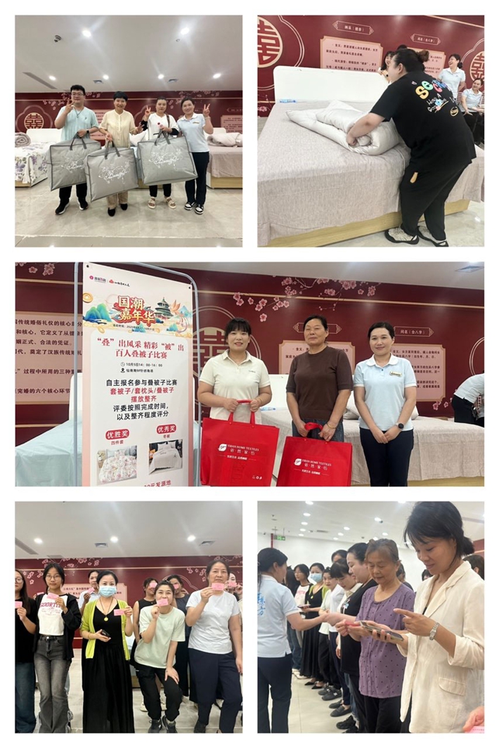 叠被子是日常生活技能,但是要叠得快叠得好就需要参与者们娴熟的技巧。随着指令发出,选手们迅速展开操作:铺平被面、对齐边角、精准折叠。