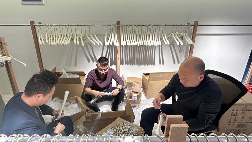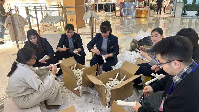 现场员工分工协作、高效配合,全身心投入忙碌中,历经三小时奋战,圆满完成3000个衣架、裤架的组装任务。通过此次紧急支援,彰显儿童商场团队凝心聚力、务实高效的工作风貌。