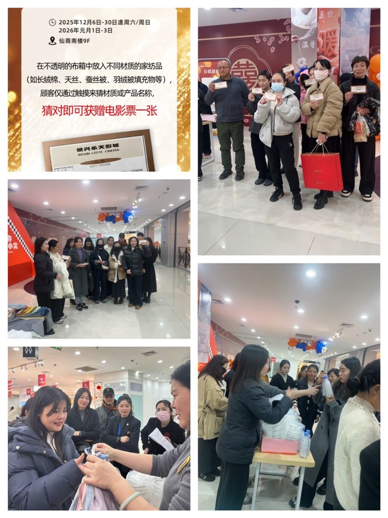 12月14日,仙商南九楼针纺商场内人流如织,气氛热烈。一场别开生面的“盲摸猜材质”互动体验活动正在此火热开展,吸引了众多顾客驻足参与。