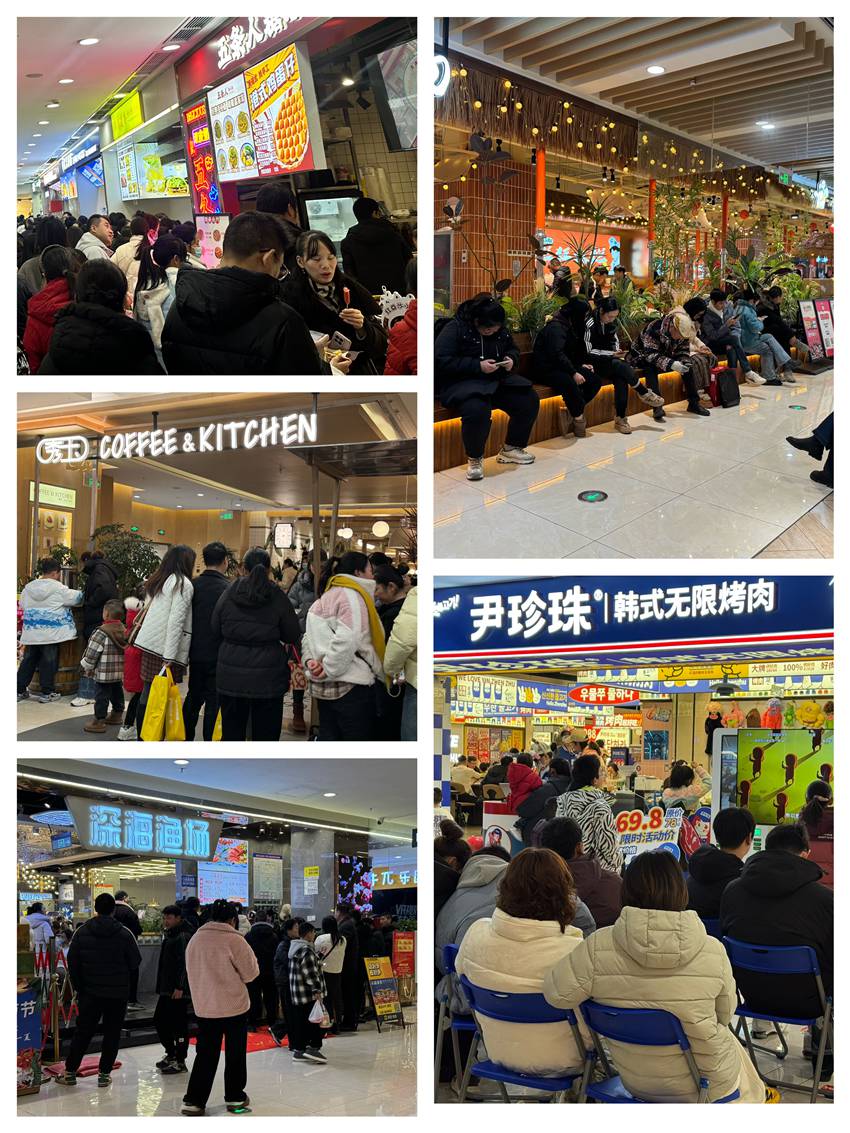 餐饮楼层成为人气聚集地,特色餐厅外等候区坐满了取号顾客,美食飘香吸引着过往人群,暖意融融的氛围与窗外寒冬形成鲜明对比。