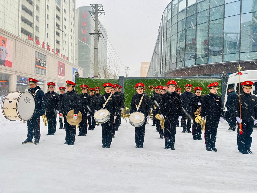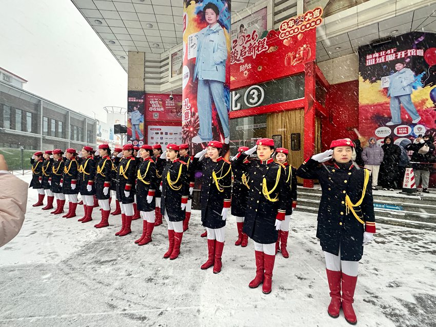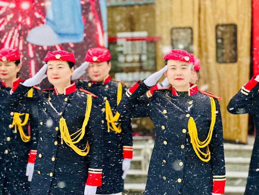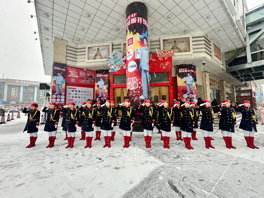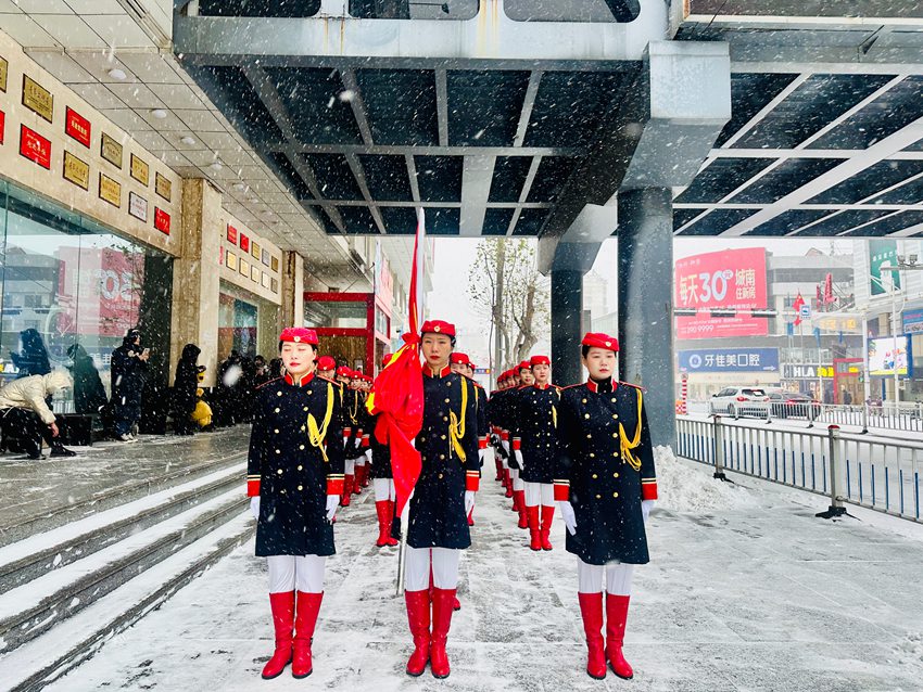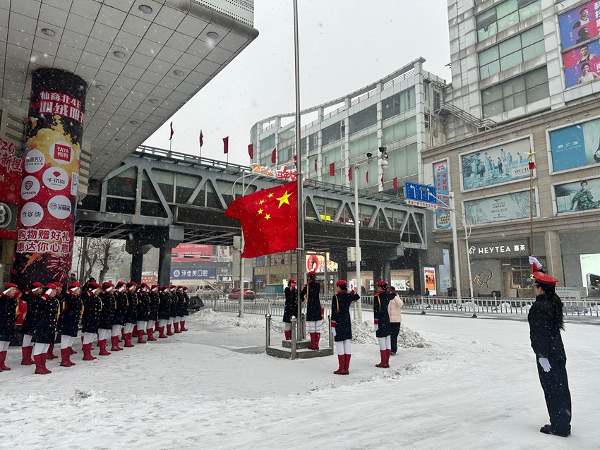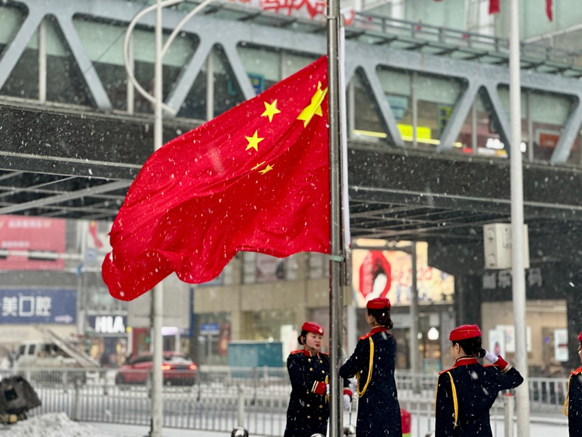 清晨的街头白雪皑皑,气温骤降,但礼仪队成员们身着笔挺礼服,精神抖擞、列队整齐。伴随着庄严的国歌,五星红旗在风雪中冉冉升起。队员们向国旗敬礼,雪花落满肩头,却无人动摇分毫。那一抹鲜红在白雪映衬下愈发夺目,成为这个冬日里最温暖、最振奋人心的画面。