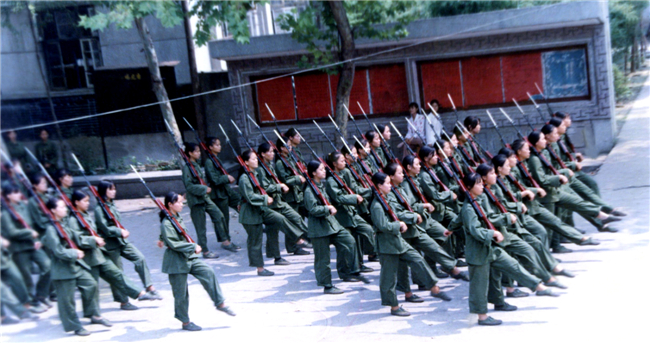 1996年7月10日-9月8日,第一、二批礼仪队员在市财贸黉舍进行封闭式军训。图为队员持***训练。前排:黄艳红、陈静、廖巧云、雷鸣、金艳、吴静云、刘睿、王天霞、康利平;二排:游志芳、何昌平、周爱华、盛荣、李爱文、易艳妮、夏艳娥、唐娅;三排:刘艳霞、郭婵娟、赵伟、别利琴、刘平、谢翠霞;四排:蔡亮慧、喻仙兰、张喻、严凤华;五排:胡荣、王敏;二方阵第一个:闵翠平(其它不可辩)。