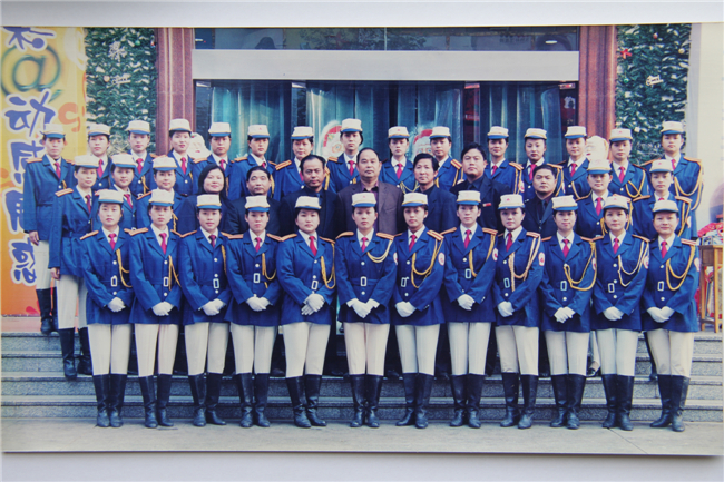 退役的第一、二批礼仪队员着礼仪服与向导合影 |