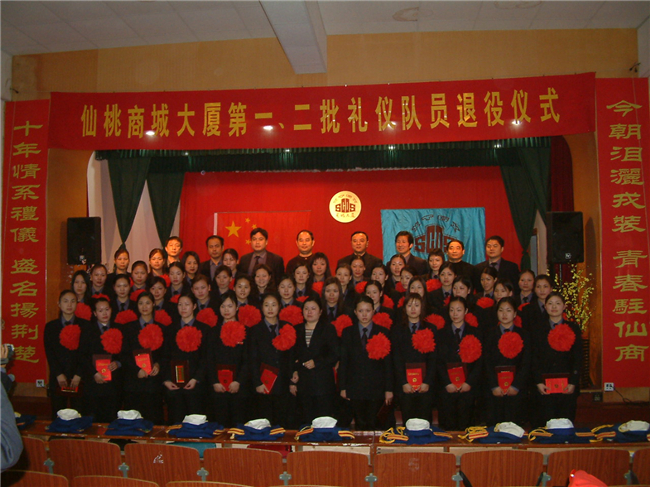 2004年11月4日,退役的第一、二批礼仪队员着礼仪服与向导合影。三排左起:刘睿、易艳妮、乐敏、胡荣、张喻、刘能新、张彩云、唐娅、苏丽、王天霞、高利敏、郭婵娟、许荣、赵娟、王萍艳;二排:胡巧英、赵伟、刘丹、刘云仙、何中新、鄢烈慧、王世兵、涂阳顺、徐守国、曾春华、刘雅萍、欧阳瑾;前排:李爱文、潘丹、舒碧荣、游志芳、吴艳、何昌平、刘艳霞、魏运华、陈亚利、熊利华、陈静、陈梅。