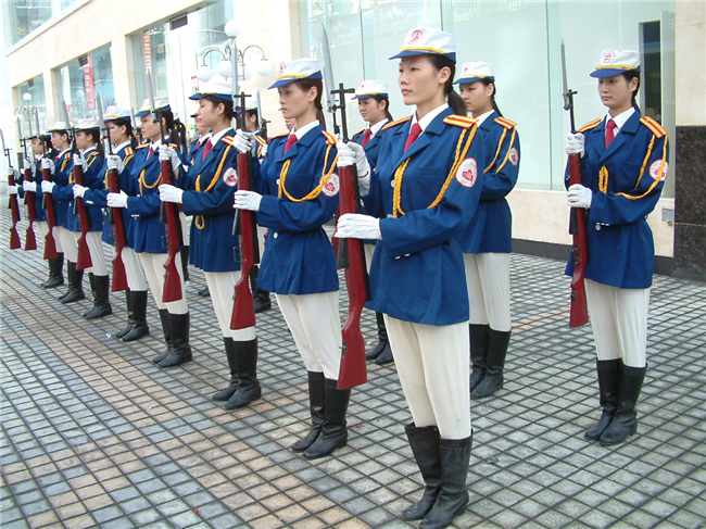 2004年9月11日,第四五批礼仪队员持**表演。前排左起:刘荣、何芬、李秀文、秦娟、杨纯、雷艳、赵丹、熊则念;二排:戴于惠、费双红、熊娜等。
